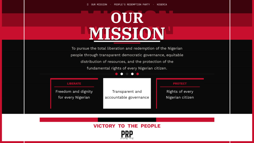 Our Mission Our mission is to pursue the total liberation and redemption of the Nigerian people through transparent democratic governance, equitable distribution of resources, and the protection of the fundamental rights of every Nigerian citizen. We are committed to fighting corruption, promoting justice, and ensuring that the dividends of democracy reach every corner of our great nation.