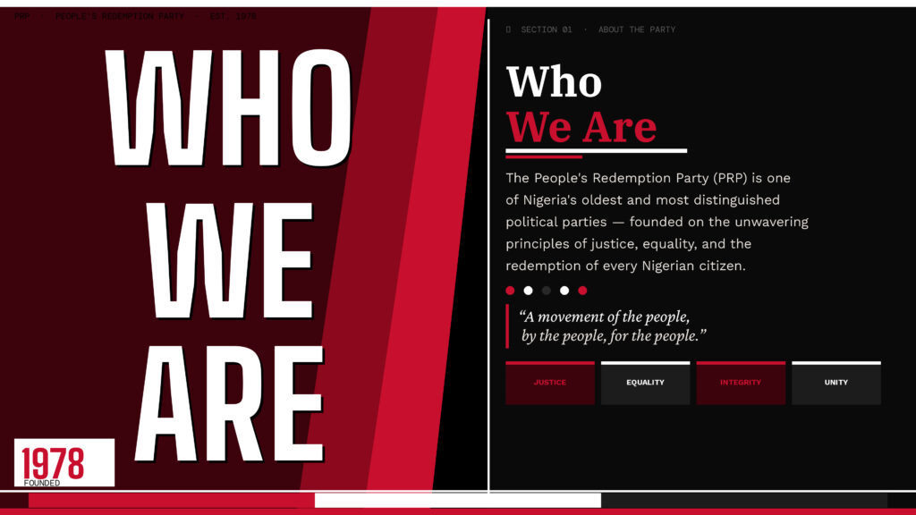 The People’s Redemption Party Who We Are The People’s Redemption Party (PRP) is one of Nigeria’s oldest and most distinguished political parties, founded on the unwavering principles of justice, equality, and the redemption of the Nigerian people. Since our establishment in 1978 by the legendary Mallam Aminu Kano, we have remained steadfast in our commitment to building a Nigeria where every citizen regardless of tribe, religion, or social status has an equal opportunity to thrive and prosper. We are not just a political party — we are a movement of the people, by the people, and for the people. Our […]